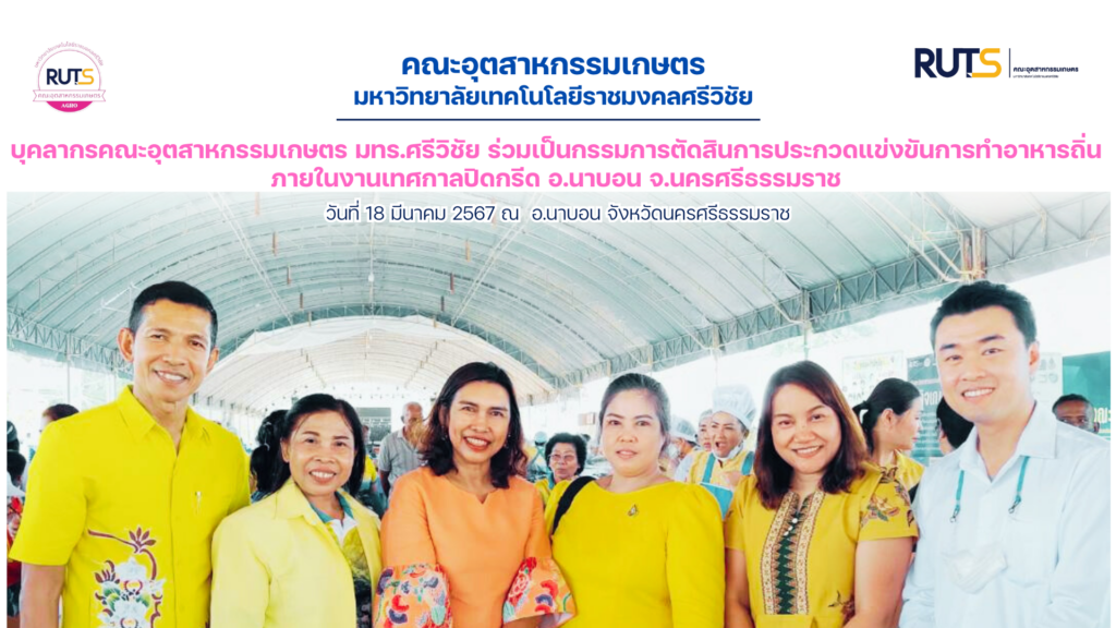 วันจันทร์ที่ 18 มีนาคม 2567 ที่ผ่านมา บุคลากรคณะอุตสาหกรรมเกษตร มทร.ศรีวิชัย ราย ผศ.ดร.สายใจ แก้วอ่อน ร่วมเป็นคณะกรรมการตัดสินการประกวดแข่งขันการทำอาหารถิ่น อ.นาบอน จ.นครศรีธรรมราช ภายในงานเทศกาลปิดกรีด ซึ่งดำเนินการอยู่ภายใต้การดูแลของอำเภอนาบอน โดยมีรายการอาหารที่ใช้สำหรับการแข่งขัน ได้แก่ เมนูอาหารจีน แฮกึ๊น และหมี่ซั่วน้ำแดง และเมนูอาหารไทย แกงส้มปลาทับทิมและข้าวยำใบไม้ การแข่งขันดังกล่าวได้รับความสนใจจากผู้เข้าเยี่ยมชมงานเป็นอย่างมาก อีกทั้งยังเป็นการอนุรักษ์และสืบสานวัฒนธรรมทางด้านอาหารใต้ไว้ให้คงอยู่สืบไป