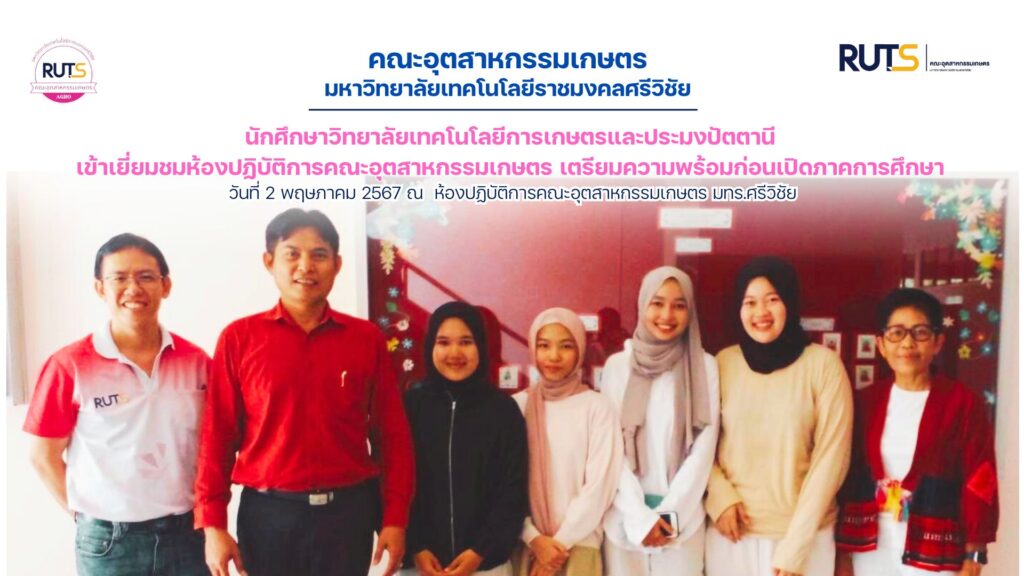 วันพฤหัสบดีที่ 2 พฤษภาคม 2567 คณะอุตสาหกรรมเกษตร มทร.ศรีวิชัย นำโดย คณบดี ผศ.ว่าที่ ร.ต. ปรีชา มุณีศรี รองคณบดีฝ่ายวิชาการและวิจัย ผศ. จรีพร เชื้อเจ็ดตน หัวหน้าหลักสูตรเทคโนโลยีและนวัตกรรมอาหาร รศ.ดร.กิตติภูมิ ศุภลักษณ์ปัญญา รวมทั้งนักวิทยาศาสตร์ ให้การต้อนรับนักศึกษาจากวิทยาลัยเทคโนโลยีการเกษตรและประมงปัตตานี ที่เดินทางมาเยี่ยมชมห้องปฏิบัติการคณะอุตสาหกรรมเกษตร และหอพักนักศึกษา เพื่อเป็นการเตรียมความพร้อมก่อนเปิดภาคการศึกษาใหม่