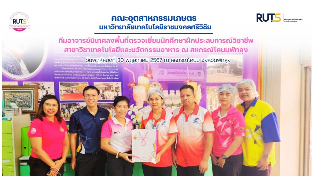 วันพฤหัสบดีที่ 30 พฤษภาคม 2567 อาจารย์นิเทศคณะอุตสาหกรรมเกษตร นำโดย รองคณบดีฝ่ายวิชาการและวิจัย ผศ.จรีพร เชื้อเจ็ดตน ประธานหลักสูตรเทคโนโลยีและนวัตกรรมอาหาร รศ.กิตติภูมิ ศุภลักษณ์ปัญญา และ ผศ.สายใจ แก้วอ่อน เดินทางลงพื้นที่ตรวจเยี่ยมนักศึกษาฝึกประสบการณ์วิชาชีพสาขาวิชาเทคโนโลยีและนวัตกรรมอาหาร ด้านกระบวนการผลิต และการควบคุมคุณภาพ ณ สหกรณ์โคนมพัทลุง จังหวัดพัทลุง ในโอกาสนี้ ทีมอาจารย์ยังได้รับการดูแลจากคุณรัตนาภรณ์ จรัสด้วง ตัวแทนสถานประกอบการเป็นอย่างดี โดยสถานประกอบการได้มอบคำชมแก่นักศึกษา นักศึกษามีความขยัน ช่างซักถาม ใฝ่เรียนรู้ อีกทั้งได้ให้ข้อเสนอแนะดี ๆ เพื่อใช้ในการพัฒนาหลักสูตรและนักศึกษาให้เป็นบัณฑิตนักปฏิบัติในลำดับต่อไป