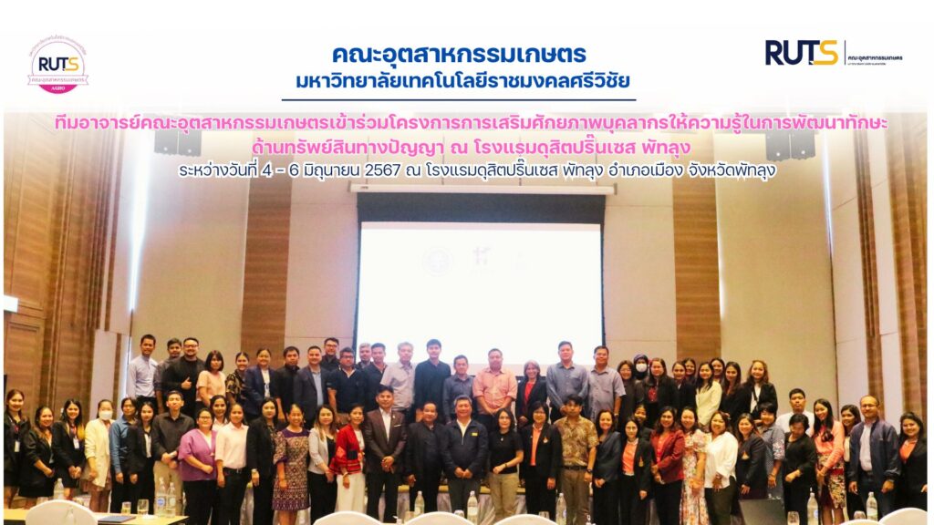 ระหว่างวันที่ 4-6 มิถุนายน 2567 ทีมอาจารย์คณะอุตสาหกรรมเกษตร นำโดย ผศ.ว่าที่ ร.ต.ปรีชา มุณีศรี คณบดีคณะอุตสาหกรรมเกษตร พร้อมด้วย ผศ.จรีพร เชื้อเจ็ดตน รองคณบดีฝ่ายวิชาการและวิจัย และ ผศ.ดร.สายใจ แก้วอ่อน อาจารย์ประจำหลักสูตรเทคโนโลยีและนวัตกรรมอาหาร เป็นตัวแทนเข้าร่วมโครงการ “การเสริมศักยภาพบุคลากรให้ความรู้ในการพัฒนาทักษะด้านทรัพย์สินทางปัญญา” ภายใต้โครงการการพัฒนาผู้ประกอบการวิสาหกิจขนาดกลางและขนาดย่อมที่ขับเคลื่อนโดยนวัตกรรมสู่การยกระดับศักยภาพธุรกิจรูปแบบใหม่ (P25) ที่จัดโดยสำนักการจัดการนวัตกรรมและถ่ายทอดเทคโนโลยี มทร.ศรีวิชัย โดยโครงการดังกล่าวมีวัตถุประสงค์เพื่อส่งเสริมศักยภาพบุคลากรให้ความรู้ในการพัฒนาทักษะด้านทรัพย์สินทางปัญญาและผลงานวิจัย รวมถึงการสร้างนวัตกรรมหรือเทคโนโลยีเข้าสู่กระบวนการทรัพย์สินทางปัญญาและผลงานวิจัย กิจกรรมจัดขึ้น ณ โรงแรม ดุสิตปริ๊นเซส พัทลุง อำเภอเมือง จังหวัดพัทลุง