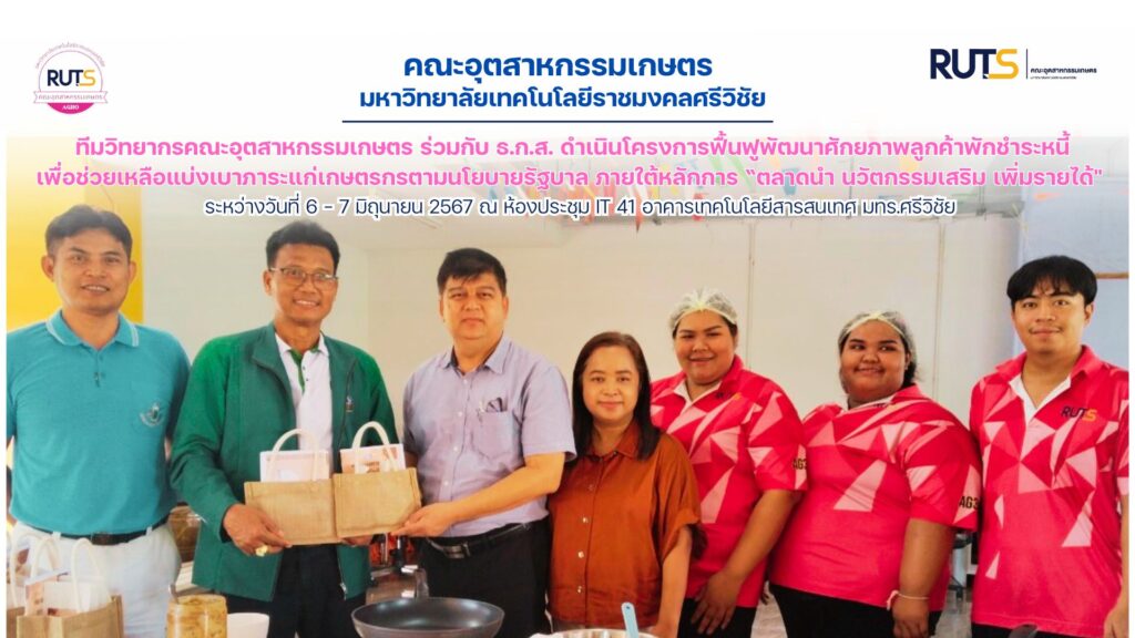 ระหว่างวันที่ 6-7 มิถุนายน 2567 ทีมวิทยากรคณะอุตสาหกรรมเกษตร มทร.ศรีวิชัย นำโดย ผศ.ดร.เสาวณีย์ ชัยเพชร ผศ.ดร.ธณิกานต์ ธรสินธุ์ พร้อมด้วยนักศึกษาสาขาวิชาการจัดการอาหารและบริการ ร่วมเป็นวิทยากรให้ความรู้ในหัวข้อ “การพัฒนากาแฟและผลิตภัณฑ์กาแฟ” ภายใต้การดำเนินการอบรมฟื้นฟูพัฒนาศักยภาพลูกค้าพักชำระหนี้ หลักสูตรฟื้นฟูพัฒนาอาชีพเดิม อาชีพเสริม เพิ่มอาชีพใหม่ โดยมีกลุ่มเป้าหมายเข้ารับการอบรมได้แก่ กลุ่มเกษตรกรจากอำเภอถ้ำพรรณรา จังหวัดนครศรีธรรมราช ซึ่งการอบรมเกษตรกรในครั้งนี้ ทีมวิทยากรได้สาธิตการทำผลิตภัณฑ์อาหารที่มีส่วนผสมของกาแฟ ได้แก่ ขนมเบื้องหลากไส้ ขนมปังสังขยาผสมกาแฟ ซึ่งเป็นผลิตภัณฑ์ที่ได้จากการต่อยอดเพิ่มมูลค่ากาแฟสายพันธุ์โรบัสต้าแห่งเทือกเขาบรรทัด โดยผลิตภัณฑ์ดังกล่าวสามารถทำได้ง่าย ๆ ในครัวเรือน และสามารถสร้างอาชีพใหม่ได้โดยใช้ทุนน้อย เป็นอีกหนึ่งช่องทางทำกินให้กับเกษตรกรที่เข้ารับการอบรม โดยกิจกรรมจัดขึ้น ณ ห้องประชุม IT 41 อาคารเทคโนโลยีสารสนเทศ มทร.ศรีวิชัย