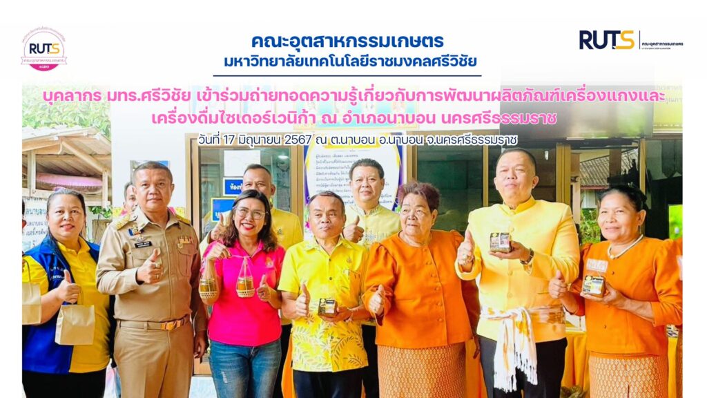 วันที่ 17 มิถุนายน 2567 นายไตรรัตน์ ไชยรัตน์ รองผู้ว่าราชการจังหวัดนครศรีธรรมราช และคณะกรรมการคัดสรรกิจกรรมพัฒนาชุมชนชุมชนดีเด่น ประจำปี 2567 ประเภทตำบลเข้มแข็งตามหลักปรัชญาของเศรษฐกิจพอเพียงตำบลนาบอน อำเภอนาบอน จังหวัดนครศรีธรรมราช โดยมี หัวหน้าส่วนราชการ ปลัดอำเภอ ข้าราชการ พนักงาน เจ้าหน้าที่ ผู้นำท้องที่ ผู้นำท้องถิ่น เครือข่าย และประชาชน ณ หมู่ที่ 10 ตำบลนาบอน อำเภอนาบอน จังหวัดนครศรีธรรมราช ในการนี้ ผศ.ดร.สายใจ แก้วอ่อน อาจารย์คณะอุตสาหกรรมเกษตร มทร.ศรีวิชัย ในฐานะเครือข่ายที่ร่วมทำงานกับหน่วยงานราชการ กลุ่มวิสาหกิจชุมชน และประชาชน ในอำเภอนาบอน เข้าร่วมกิจกรรมและแลกเปลี่ยนถ่ายทอดความรู้เกี่ยวกับการพัฒนาผลิตภัณฑ์เครื่องแกง และเครื่องดื่มไซเดอร์เวนิก้าด้วย