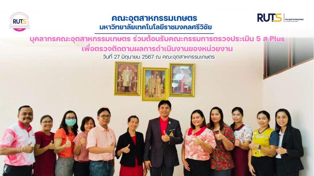 วันที่ 27 มิถุนายน 2567 บุคลากรคณะอุตสาหกรรมเกษตร มทร.ศรีวิชัย นำโดย คณบดีคณะอุตสาหกรรมเกษตร ผศ.ว่าที่ ร.ต.ปรีชา มุณีศรี ผศ.ดร.ศิรินาถ ศรีอ่อนนวล หัวหน้างานประกันคุณภาพการศึกษา พร้อมบุคลากรสายวิชาการและสายสนับสนุน ร่วมให้การต้อนรับคณะกรรมการตรวจประเมิน 5 ส Plus เพื่อตรวจติดตามผลการดำเนินงานของหน่วยงาน นำทีมโดย คุณจงกลนี ศรีจงกล ทำหน้าที่แทนประธานกรรมการ คุณอณงค์ทิพย์ วงศ์กูล กรรมการ และ คุณปานหทัย ปานสิทธิ์ กรรมการและเลขานุการ โดยดำเนินการตรวจติดตามผลการดำเนินงานตามพื้นที่ต่าง ๆ ที่คณะฯ ดำเนินการส่งตรวจประเมิน ทั้งห้องสำนักงาน ห้องพักอาจารย์ ห้องปฏิบัติการ และสภาพแวดล้อมบริเวณอาคาร ที่อยู่ในความดูแลของคณะฯ ผลการประเมินอยู่ในระดับที่น่าพึงพอใจ และได้รับข้อเสนอแนะจากคณะกรรมการเพื่อการพัฒนาในโอกาสต่อไป
