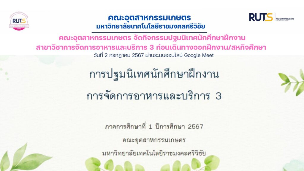 วันอังคารที่ 2 กรกฎาคม 2567 อาจารย์ประจำหลักสูตรสาขาวิชาการจัดการอาหารและบริการ ดำเนินการจัดกิจกรรมปฐมนิเทศนักศึกษาฝึกงาน สาขาวิชาการจัดการอาหารและบริการ 3 (Internship in Food and Service Management III) ก่อนเดินทางออกฝึกงาน/สหกิจศึกษาตามสถานประกอบการต่าง ๆ นำทีมโดย ผศ.ดร.อภิญญา วณิชพันธุ์ และอาจารย์ประจำหลักสูตรเข้าร่วมกิจกรรมดังกล่าว โดยอาจารย์ผู้รับผิดชอบรายวิชาได้ดำเนินการชี้แจงรายละเอียดการดำเนินการของรายวิชา ข้อควรปฏิบัติในระหว่างการฝึกงานฯ และแนวทางการประเมินผลรายวิชา พร้อมกันนี้ คณบดี ผศ.ว่าที่ ร.ต. ปรีชา มุณีศรี และ หัวหน้าหลักสูตร ผศ.ดวงเดือน สงฤทธิ์ ได้ให้โอวาทแก่นักศึกษาในกิจกรรมดังกล่าว กิจกรรมจัดขึ้นผ่านการประชุมออนไลน์ Google Meet.