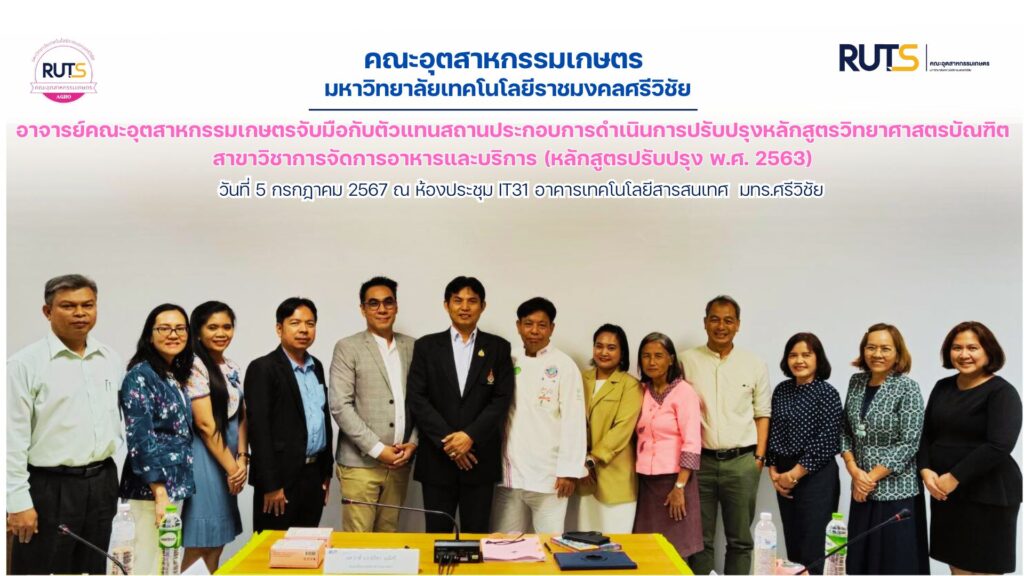วันที่ 5 กรกฎาคม 2567 คณะอุตสาหกรรมเกษตร มทร.ศรีวิชัย นำโดย คณบดี ผศ.ว่าที่ ร.ต.ปรีชา มุณีศรี พร้อมด้วย รองคณบดีฝ่ายบริหารและวางแผน ผศ.สุภาษิต ชูกลิ่น รองคณบดีฝ่ายพัฒนานักศึกษา อ.ศรีอุบล ทองประดิษฐ์ และอาจารย์ประจำหลักสูตรการจัดการอาหารและบริการ ดำเนินการโครงการการปรับปรุงหลักสูตรวิทยาศาสตรบัณฑิต สาขาวิชาการจัดการอาหารและบริการ (หลักสูตรปรับปรุง พ.ศ. 2563) โดยโครงการดังกล่าวมีวัตถุประสงค์เพื่อปรับปรุงหลักสูตรให้มีความทันสมัย สอดคล้องกับสถานการณ์และความต้องการของตลาดแรงงานในอุตสาหกรรมด้านการจัดการอาหารและบริการ การท่องเที่ยว ธุรกิจโรงแรม และธุรกิจที่เกี่ยวข้องในปัจจุบัน อีกทั้งยังเป็นการปรับปรุงรายวิชาและกระบวนการจัดการเรียนการสอนให้สามารถผลิตบัณฑิตที่มีความรู้ มีทักษะ และมีคุณสมบัติตรงตามความต้องการของสถานประกอบการ และมีความพร้อมในการประกอบอาชีพได้ทันทีหลังสำเร็จการศึกษา ในโอกาสนี้ ได้รับเกียรติจากคณะกรรมการผู้ทรงคุณวุฒิ ซึ่งเป็นตัวแทนจากสถานประกอบการและตัวแทนจากคณะเทคโนโลยีการจัดการ มทร.ศรีวิชัย เข้าร่วมโครงการเพื่อยกร่างหลักสูตร และให้ข้อเสนอแนะในการปรับปรุงหลักสูตร จำนวน 4 ท่าน ได้แก่ 1. เชฟภชภณ ชนะปราชญ์ (โรงแรมพีช ฮิลล์ รีสอร์ต) 2. คุณสามารถ แก้วประสม (โรงแรมกะตะธานี) 3. คุณเนรัญชลา สมบูรณ์ธนสิริ (บริษัทเดอะ ไมเนอร์ ฟู้ด กรุ๊ป อินเตอร์เนชั่นแนล จำกัด (มหาชน))และ 4. ผู้ช่วยศาสตราจารย์เย็นจิต นาคพุ่ม (คณะเทคโนโลยีการจัดการ) กิจกรรมจัดขึ้น ณ ห้องประชุม IT 31 อาคารเทคโนโลยีสารสนเทศ มทร.ศรีวิชัย