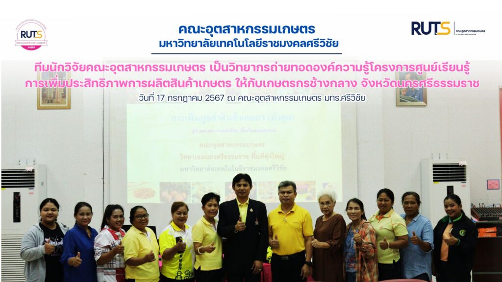 วันที่ 17 กรกฎาคม 2567 คณะอุตสาหกรรมเกษตร มทร.ศรีวิชัย นำทีมโดยคณบดี ผศ.ว่าที่ ร.ต.ปรีชา มุณีศรี ผศ.จรีพร เชื้อเจ็ดตน ผศ.สายใจ แก้วอ่อน และ อาจารย์ศรีอุบล ทองประดิษฐ์ ทีมนักวิจัย ให้การต้อนรับกลุ่มเกษตรกรจากอำเภอช้างกลาง จังหวัดนครศรีธรรมราช ที่เดินทางมาเข้าร่วมโครงการศูนย์เรียนรู้การเพิ่มประสิทธิภาพการผลิตสินค้าเกษตร ประจำปีงบประมาณ พ.ศ. 2567 ณ คณะอุตสาหกรรมเกษตร มทร.ศรีวิชัย โดยมีกลุ่มเป้าหมายเข้าร่วมโครงการประกอบด้วย เกษตรกรผู้นำ และเกษตรกรต้นแบบในอำเภอช้างกลาง เจ้าหน้าที่ผู้รับผิดชอบงาน ศพก. ระดับอำเภอ และผู้เกี่ยวข้อง รวมทั้งสิ้น 18 ราย ดำเนินการโดยสำนักงานเกษตรอำเภอช้างกลาง จังหวัดนครศรีธรรมราช โครงการดังกล่าวมีวัตถุประสงค์เพื่อบ่มเพาะเกษตรกรเตรียมพร้อมไปสู่การเป็นผู้ประกอบการ และนำความรู้ที่ได้รับไปถ่ายทอดให้กับเกษตรกรทั่วไป ซึ่งบุคลากรคณะอุตสาหกรรมเกษตรได้รับเชิญเป็นวิทยากรฝึกอบรมถ่ายทอดองค์ความรู้ในหลักสูตร “การเพิ่มมูลค่าสินค้าเกษตร (มังคุด)” เป็นผลิตภัณฑ์ ไวน์มังคุด ซึ่งถือได้ว่าเป็นอีกหนึ่งผลิตภัณฑ์ที่สามารถทำได้ง่ายในครัวเรือน สามารถเก็บรักษาได้นาน และสร้างมูลค่าเพิ่มให้กับวัตถุดิบได้เป็นอย่างดี
