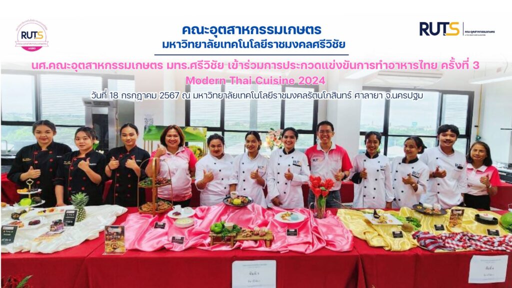 วันที่ 18 กรกฎาคม 2567 ที่ผ่านมา คณะอุตสาหกรรมเกษตร มทร.ศรีวิชัย นำทีมโดยอาจารย์จิระนาถ รุ่งช่วง ผศ.ดวงเดือน สงฤทธิ์ และ รศ.กิตติภูมิ ศุภลักษณ์ปัญญา ผู้ควบคุมทีมนำนักศึกษาหลักสูตรการจัดการอาหารและบริการ ได้แก่ นางสาวจุฬาลักษณ์ แท่นศิริ นางสาวศตพร ทองนุ่ม นางสาวศิริญากร มากทอง นางสาวสิราวรรณ น้อยมุสิก นางสาวเบญจมาศ เพรชหนองชุม และนายกันตชาติ ชายทองแก้ว เข้าร่วมการประกวดแข่งขันการทำอาหารไทย ครั้งที่ 3 Modern Thai Cuisine 2024 ที่จัดโดย คณะวิทยาศาสตร์และเทคโนโลยี มหาวิทยาลัยเทคโนโลยีราชมงคลรัตนโกสินทร์ ศาลายา จัดการแข่งขันประเภททีม ภายใต้โจทย์ “การปรุงอาหารคาว-หวาน อย่างละ 2 เมนู” การเข้าร่วมการแข่งขันในครั้งนี้ ทำให้นักศึกษาได้มีโอกาสเปิดประสบการณ์ใหม่ ๆ ในด้านการแข่งขันทำอาหารในเวทีที่ใหญ่ขึ้น ได้พบกับผู้เข้าร่วมการแข่งขันที่มีความสามารถและมีทักษะ สามารถนำความรู้รวมถึงข้อเสนอแนะที่ได้รับจากคณะกรรมการมาพัฒนาตนเองให้เก่งยิ่งขึ้น โดยการแข่งขันดังกล่าวจัดขึ้น ณ มหาวิทยาลัยเทคโนโลยีราชมงคลรัตนโกสินทร์ ศาลายา จ.นครปฐม