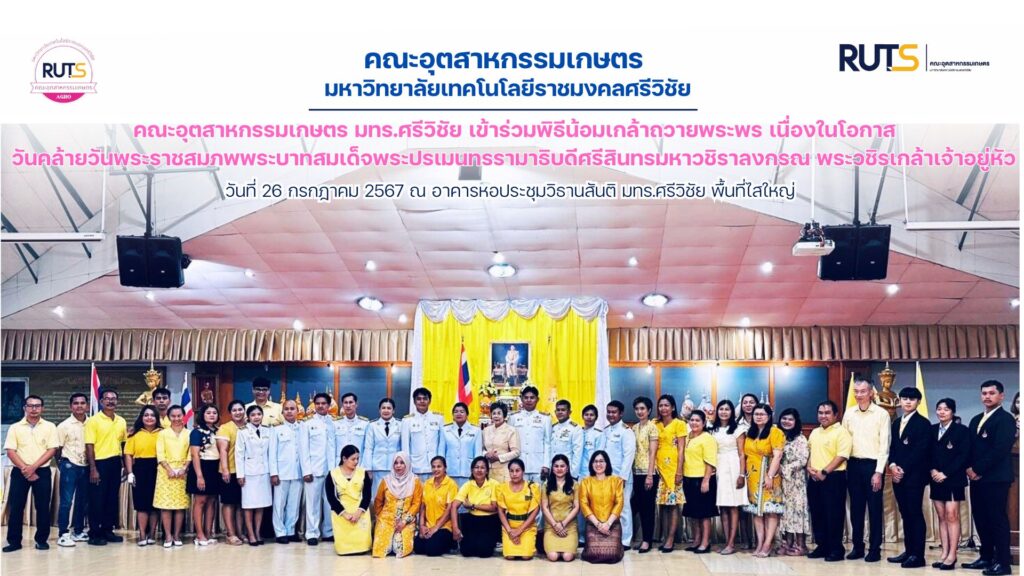 วันศุกร์ที่ 26 กรกฎาคม 2567 คณะอุตสาหกรรมเกษตร มทร.ศรีวิชัย นำโดย ผศ.ว่าที่ ร.ต. ปรีชา มุณีศรี คณบดี และนักศึกษาคณะอุตสาหกรรมเกษตร เข้าร่วมพิธีถวายเครื่องราชสักการะวางพานพุ่มทอง-พานพุ่มเงิน พิธีน้อมเกล้าถวายพระพรเนื่องในโอกาสวันคล้ายวันพระราชสมภพพระบาทสมเด็จพระปรเมนทรรามาธิบดีศรีสินทรมหาวชิราลงกรณ พระวชิรเกล้าเจ้าอยู่หัว ณ อาคารหอประชุมวิธานสันติ มหาวิทยาลัยเทคโนโลยีราชมงคลศรีวิชัย วิทยาเขตนครศรีธรรมราช พื้นที่ไสใหญ่