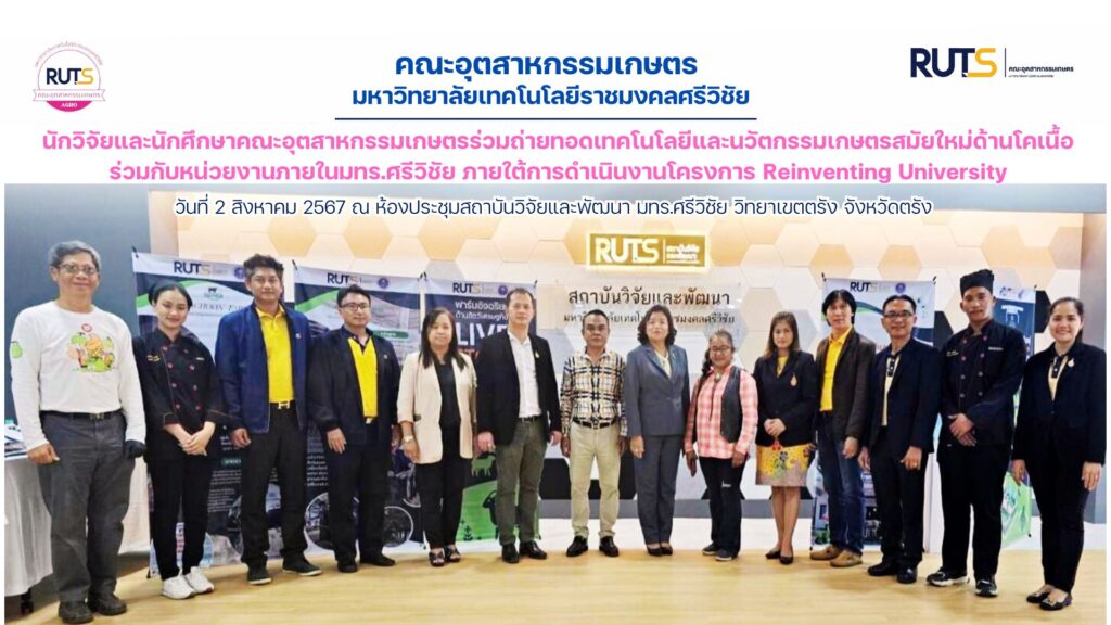 วันที่ 2 สิงหาคม 2567 ที่ผ่านมา นักวิจัย ราย ผศ.ดร.เสาวณีย์ ชัยเพชร และนักศึกษาสาขาวิชาการจัดการอาหารและบริการ คณะอุตสาหกรรมเกษตร เข้าร่วมถ่ายทอดเทคโนโลยีและนวัตกรรมเกษตรสมัยใหม่ด้านโคเนื้อ โดยกิจกรรมดังกล่าวเป็นการดำเนินงานร่วมกับหน่วยงานภายใน มทร.ศรีวิชัย ได้แก่ คณะเกษตรศาสตร์ ดูแลด้านเกษตรพืชและสัตว์ มทร.ศรีวิชัย วิทยาเขตตรัง ดูแลด้านประมง วิทยาลัยรัตภูมิ ดูแลด้าน smart farm ในโอกาสนี้ ผศ.ดร.ประพจน์ มลิวัลย์ อาจารย์ประจำคณะเกษตรศาสตร์ เป็นผู้ติดตาม รวบรวม และนำเสนอข้อมูลเพื่อรายงานผลการดำเนินงานรอบ 12 เดือน โครงการ Reinventing University “โครงการพลิกโฉมการเรียนรู้ด้านเกษตรสมัยใหม่ด้วยนวัตกรรมและศาสตร์เชิงบูรณาการ” งบประมาณจากกระทรวงการอุดมศึกษา วิทยาศาสตร์ วิจัยและนวัตกรรม นอกจากนี้ นักศึกษาได้มีโอกาสนำเสนอเมนูเนื้อชาบู ซึ่งได้รับการสนับสนุนผลิตภัณฑ์เนื้อจากอรชุณฟาร์ม และ แกงเนื้อคั่วกลิ้งเมืองคอนจากกลุ่มโคบาลบ้านพ่อ การันตีความนุ่ม อร่อย ฉ่ำ กลิ่นหอมละมุน กิจกรรมจัดขึ้น ณ ห้องประชุมสถาบันวิจัยและพัฒนา มหาวิทยาลัยเทคโนโลยีราชมงคลศรีวิชัย วิทยาเขตตรัง จังหวัดตรัง
