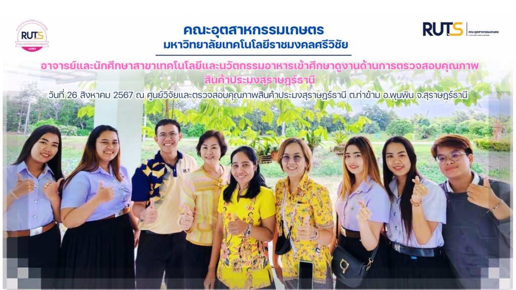 วันจันทร์ที่ 26 สิงหาคม 2567 อาจารย์ประจำคณะอุตสาหกรรมเกษตร มทร.ศรีวิชัย นำโดย ผศ.อภิญญา วณิชพันธุ์ พร้อมด้วย รศ.กิตติภูมิ ศุภลักษณ์ปัญญา นำนักศึกษาหลักสูตรวิทยาศาสตรบัณฑิต สาขาวิชาเทคโนโลยีและนวัตกรรมอาหาร จากรายวิชาการควบคุมคุณภาพอาหาร ประจำภาคการศึกษาที่ 1 ปีการศึกษา 2567 เข้าศึกษาดูงานการตรวจสอบคุณภาพสินค้าประมง ณ ศูนย์วิจัยและตรวจสอบคุณภาพสินค้าประมงสุราษฎร์ธานี ตำบลท่าข้าม อำเภอพุนพิน จังหวัดสุราษฎร์ธานี การศึกษาดูงานดังกล่าวมีวัตถุประสงค์เพื่อให้นักศึกษาได้มีโอกาสเรียนรู้เกี่ยวกับการตรวจสอบคุณภาพสินค้าประมงและเกณฑ์มาตรฐานความปลอดภัยจากหน่วยงานที่มีหน้าที่ควบคุม ตรวจสอบ กำกับดูแลและให้การรับรองคุณภาพและความปลอดภัยของสินค้าประมง ด้วยกระบวนการทางจุลินทรีย์ เคมี และกายภาพ ให้เป็นไปตามกฎหมายและมาตรฐานที่เกี่ยวข้อง ในการศึกษาดูงานครั้งนี้ได้รับความอนุเคราะห์จาก ผู้อำนวยการศูนย์วิจัยและตรวจสอบคุณภาพสินค้าประมงสุราษฎร์ธานี นางธีรยา สรรพวรพงษ์ ที่ให้ต้อนรับคณะอาจารย์และนักศึกษา รวมทั้ง ศิษย์เก่าคณะอุตสาหกรรมเกษตร มทร.ศรีวิชัย คุณประทุมวัลย์ เจริญพร นักวิชาการผลิตภัณฑ์อาหาร (ชำนาญการพิเศษ) และคณะทำงาน ร่วมบรรยาย สาธิต และนำชมห้องปฏิบัติการ การตรวจวิเคราะห์ยาปฏิชีวนะ Oxolinic Acid ด้วยเครื่อง HPLC, การตรวจวิเคราะห์ Cadmium (Cd) ด้วยเครื่อง Atomic Absorption Spectrophotometer (AAS) ระบบ Graphite furnace และการตรวจวิเคราะห์ Mercury (Hg) ด้วยเครื่อง Mercury Analyzer ในสินค้าประมง ตามลำดับ