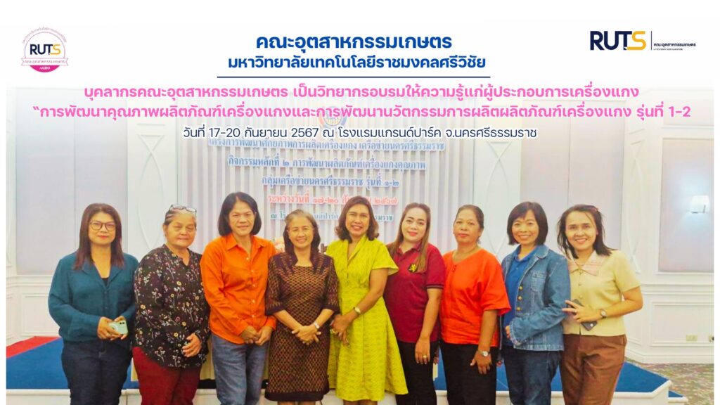 เมื่อวันที่ 17-20 กันยายน 2567 ที่ผ่านมา อาจารย์ประจำคณะอุตสาหกรรมเกษตร มทร.ศรีวิชัย ราย ผศ.ดร.สายใจ แก้วอ่อน และ ผศ.ดวงเดือน สงฤทธิ์ ได้รับเชิญเป็นวิทยากรบรรยายให้ความรู้ในโครงการพัฒนาศักยภาพการผลิตเครื่องแกงคุณภาพ เครือข่ายนครศรีธรรมราช ในส่วนกลางน้ำ : การพัฒนาคุณภาพผลิตภัณฑ์เครื่องแกง และการพัฒนานวัตกรรมการผลิตผลิตภัณฑ์เครื่องแกง รุ่นที่ 1-2 ซึ่งโครงการดังกล่าวอยู่ภายใต้การดำเนินงานของสำนักงานพัฒนาชุมชนจังหวัดนครศรีธรรมราช โดยมีผู้เข้าร่วมกิจกรรมเป็นผู้ประกอบการเครื่องแกง จำนวน 70 กลุ่ม รวมทั้งสิ้นประมาณ 140 คน และผู้ที่เกี่ยวข้องอีกจำนวน 30 คน กิจกรรมดังกล่าวมีวัตถุประสงค์เพื่อฟื้นฟูและเสริมสร้างงาน สร้างอาชีพ ตลอดจนพัฒนาการผลิตเครื่องแกงให้มีคุณภาพ เป็นผลิตภัณฑ์ชุมชนเชิงนวัตกรรม โดยกิจกรรมการอบรมจัดขึ้น ณ โรงแรมแกรนด์ปาร์ค จ.นครศรีธรรมราช
