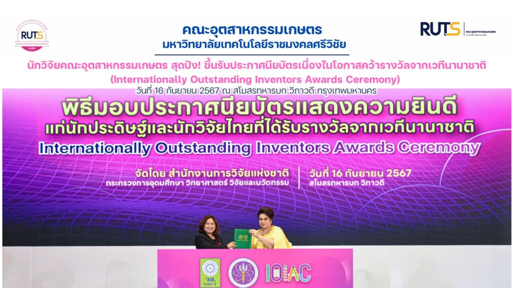 เมื่อวันที่ 16 กันยายน 2567 ที่ผ่านมา นักวิจัยคณะอุตสาหกรรมเกษตร มทร.ศรีวิชัย ราย อาจารย์จิระนาถ รุ่งช่วง อาจารย์ประจำหลักสูตรการจัดการอาหารและบริการ ขึ้นรับประกาศนียบัตรเนื่องในโอกาสคว้ารางวัลจากเวทีนานาชาติ (Internationally Outstanding Inventors Awards Ceremony) ที่จัดโดย สำนักงานการวิจัยแห่งชาติ (วช.) กระทรวงการอุดมศึกษา วิทยาศาสตร์ วิจัยและนวัตกรรม โดย อาจารย์จิระนาถ รุ่งช่วง คว้ารางวัลเหรียญทอง จากเวที “Indonesia Inventors Day 2024” (IID 2024) สาธารณรัฐอินโดนีเซีย