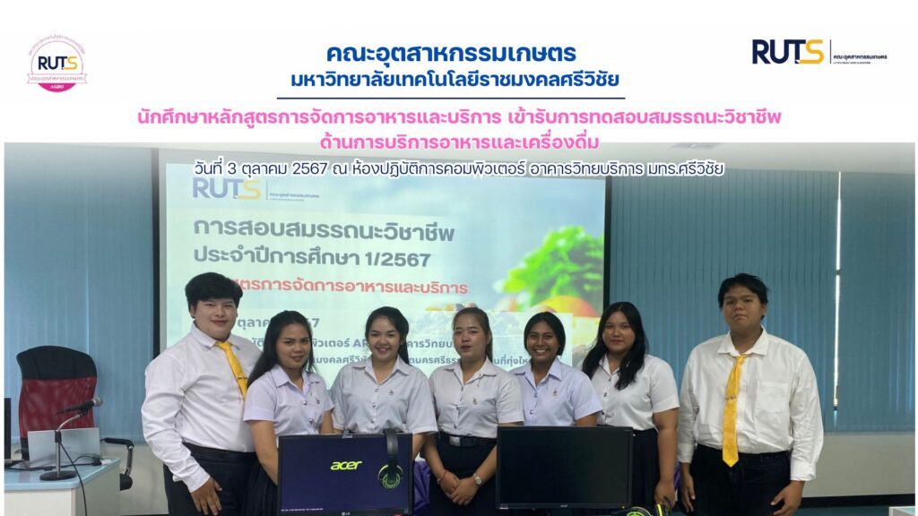 วันที่ 3 ตุลาคม 2567 หลักสูตรการจัดการอาหารและบริการ โดย ผศ.ดร.อภิญญา วณิชพันธุ์ และอาจารย์จิระนาถ รุ่งช่วง ดำเนินการจัดสอบสมรรถนะวิชาชีพให้กับนักศึกษาในหลักสูตร กิจกรรมดังกล่าวมีวัตถุประสงค์เพื่อให้นักศึกษาได้มีองค์ความรู้ในหลายมิติ โดยได้กำหนดการสอบสมรรถนะวิชาชีพ ภาคทฤษฎี ประจำปีการศึกษา 1/2567 ในวันนี้ มีนักศึกษาที่คาดว่าจะจบและต้องเข้าสอบ จำนวน 8 คน ยกเว้นนักศึกษาที่ผ่านการทดสอบสมรรถนะมาตรฐานฝีมือแรงงาน สาขาพนักงานแผนกบริการอาหารและเครื่องดื่มในธุรกิจโรงแรมและภัตตาคาร ระดับที่ 1 แล้ว กิจกรรมทดสอบจัดขึ้น ณ ห้องปฏิบัติการคอมพิวเตอร์ อาคารวิทยบริการ มทร.ศรีวิชัย