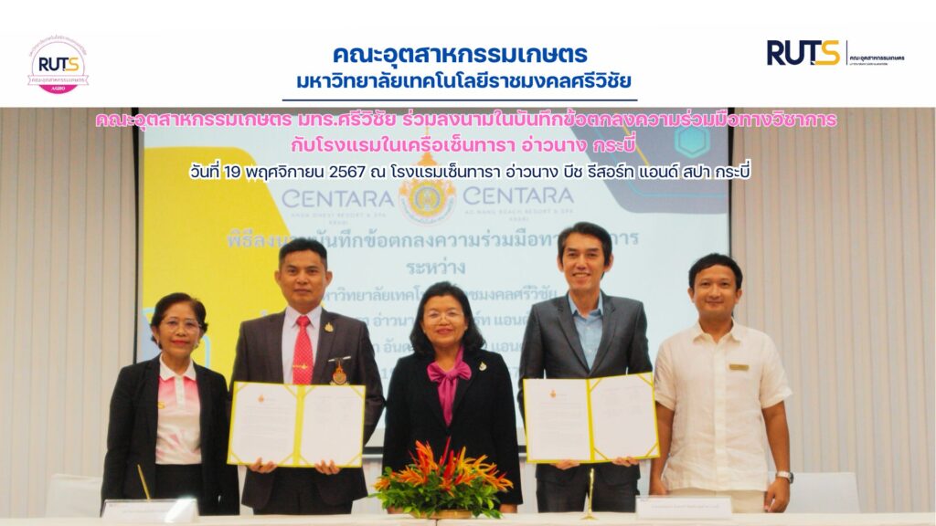 วันอังคารที่ 19 พฤศจิกายน 2567 คณะอุตสาหกรรมเกษตร มหาวิทยาลัยเทคโนโลยีราชมงคลศรีวิชัย นำทีมโดย ผู้ช่วยศาสตราจารย์ ว่าที่ร้อยตรีปรีชา มุณีศรี คณบดีคณะอุตสาหกรรมเกษตร พร้อมด้วยรองคณบดีฝ่ายวิชาการและวิจัย ผู้ช่วยศาสตราจารย์จรีพร เชื้อเจ็ดตน เข้าร่วมพิธีลงนามในบันทึกข้อตกลงความร่วมมือทางวิชาการระหว่าง มหาวิทยาลัยเทคโนโลยีราชมงคลศรีวิชัย กับโรงแรม เซ็นทารา อ่าวนาง บีช รีสอร์ท แอนด์ สปากระบี่ และ โรงแรม เซ็นทารา อันดาเทวี รีสอร์ท แอนด์ สปา กระบี่ การดำเนินงานจัดขึ้น ณ ห้องประชุมอารีย์ โรงแรม เซ็นทารา อ่าวนาง บีช รีสอร์ทแอนด์ สปา กระบี่