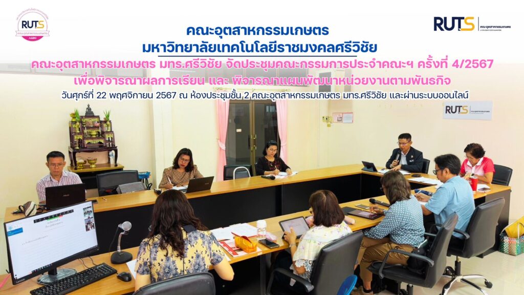 วันศุกร์ที่ 22 พฤศจิกายน 2567 คณะอุตสาหกรรรมเกษตร มทร.ศรีวิชัย นำโดย คณบดี ผู้ช่วยศาสตราจารย์ว่าที่ร้อยตรีปรีชา มุณีศรี ดำเนินการจัดประชุมคณะกรรมการประจำคณะอุตสาหกรรมเกษตร ครั้งที่ 4/2567 เพื่อพิจารณาผลการเรียนของนักศึกษาและอนุมัติผลการเรียน ภาคการศึกษาที่ 1/2567 และรับทราบผลการดำเนินงานตามพันธกิจของหน่วยงานทั้ง 5 ด้าน โดยมีคณะกรรมการประจำคณะฯ ในแต่ละตำแหน่งเข้าร่วมประชุม ประกอบด้วย คณะกรรมการผู้ทรงคุณวุฒิ ราย รศ.จารุยา ขอพลอยกลาง คุณวัชรินทร์ ไชยานุพงศ์ เชฟภชภณ ชนะปราชญ์ และ คณะกรรมการบริหารคณะฯ ประกอบด้วย คณบดี รองคณบดีทั้ง 3 ฝ่าย หัวหน้าหลักสูตร และตัวแทนจากคณาจารย์ประจำ เข้าร่วมประชุมเพื่อขับเคลื่อนแผนการดำเนินงานของหน่วยงานอย่างมีเป้าหมาย โดยการประชุมจัดขึ้น ณ ห้องประชุมชั้น 2 อาคารคณะอุตสาหกรรมเกษตร มทร.ศรีวิชัย และจัดประชุมผ่านระบบออนไลน์ Zoom Cloud Meetings