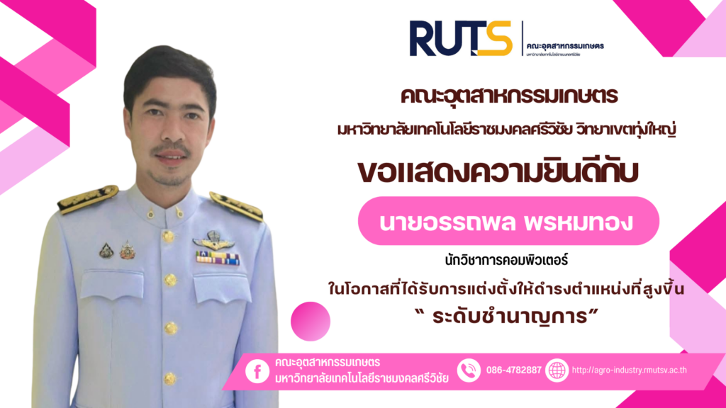 คณณะอุตสาหกรรมเกษตร มหาวิทยาลัยเทคโนโลยีราชมงคลศรีวิชัย วิทยาเขตนครศรีธรรรมราช ขอแสดงความยินดีกับ “นายอรรถพล พรหมทอง” ในโอกาสได้รับการแต่งตั้งให้ดำรงตำแหน่งสูงขึ้น “ตำแหน่งนักวิชาการคอมพิวเตอร์ ชำนาญการ“ผ่านการอนุมัติแต่งตั้งจากคณะกรรมการบริหารงานบุคคลประจำมหาวิทยาลัย เมื่อวันที่ 6 ธันวาคม 2567
