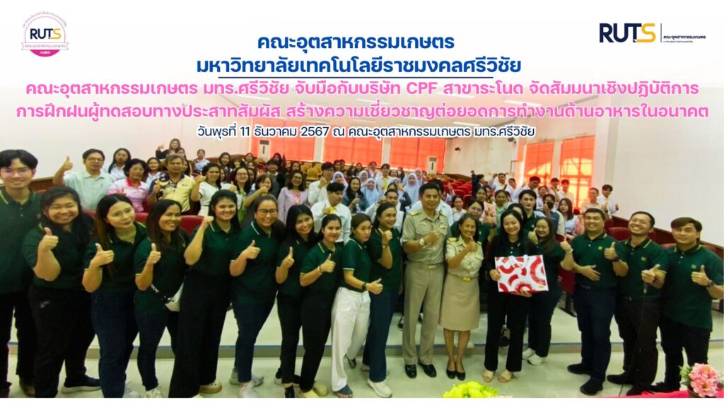 เมื่อวันที่ 11 ธันวาคม 2567 คณะอุตสาหกรรมเกษตร ได้รับความความอนุเคราะห์จาก บริษัทเจริญโภคภัณฑ์อาหาร จำกัด นำโดย คุณรัชนีพร รอดสุข รองผู้อำนวยการด้านการประกันคุณภาพ บริษัท เจริญโภคภัณฑ์อาหาร จำกัด มหาชน ธุรกิจแปรรูปสัตว์น้ำ ระโนด จังหวัดสงขลา จัดโครงการสัมมนาเชิงปฏิบัติการ เรื่อง การฝึกฝนผู้ทดสอบทางประสาทสัมผัส โดยมีวัตถุประสงค์ในการจัดโครงการในครั้งเพื่อให้นักศึกษาเข้าใจในพื้นฐานของการประเมินคุณภาพทางประสาทสัมผัส สามารถแยกแยะการรับรู้เพื่อเป็นพื้นฐานสำหรับการฝึกฝนทางประสาทสัมผัส และสามารถนำไปประยุกต์ในในการทำงานในอนาคตได้ ในการอบรมครั้งนี้ ได้รับความอนุเคราะห์จากศิษย์เก่าคณะอุตสาหกรรมเกษตร จำนวน 3 ท่าน ได้แก่ คุณสุพัชรีย์ นุ่นสุวรรณ, คุณจิตชยา เฉิดฉิ้น และคุณอับดลเล๊าะ อาดำ มาเป็นวิทยากรร่วมในการให้ความรู้แก่น้อง ๆ ศิษย์ปัจจุบัน