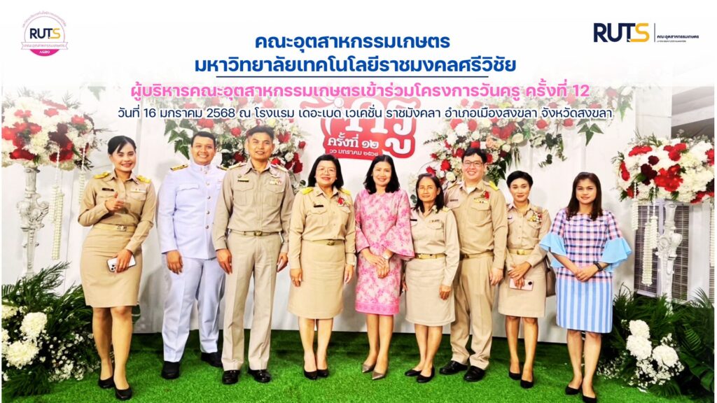 วันพฤหัสบดีที่ 16 มกราคม 2568 ผู้บริหารสำนักงานวิทยาเขตนครศรีธรรมราช รองอธิการบดีประจำวิทยาเขตนครศรีธรรมราช ผศ.ดร.ขวัญหทัย ใจเปี่ยม และ ผู้บริหารคณะอุตสาหกรรมเกษตร มทร.ศรีวิชัย นำโดย ผศ.ว่าที่ ร.ต.ปรีชา มุณีศรี คณบดี และ ผศ.ดวงเดือน สงฤทธิ์ รองคณบดีฝ่ายพัฒนานักศึกษา เข้าร่วมโครงการวันครู ครั้งที่ 12 “การศึกษาเพื่อการพัฒนาที่ยั่งยืน – Education for Sustainable Development” ณ โรงแรม เดอะเบด เวเคชั่น ราชมังคลา อำเภอเมืองสงขลา จังหวัดสงขลา ซึ่งดำเนินการโดย คณะครุศาสตร์อุตสาหกรรมและเทคโนโลยี โดยโครงการดังกล่าวมีวัตถุประสงค์เพื่อเชิดชูเกียรติบุคลากรทางการศึกษา กิจกรรมภายในงานประกอบด้วย พิธีประดับอินทรธนูครูใหม่ และพิธีมอบโล่เกียรติคุณเชิดชูเกียรติแก่ครูผู้ได้รับรางวัล พร้อมทั้งร่วมรับฟังเสวนาในหัวข้อ “การศึกษาเพื่อการพัฒนาที่ยั่งยืน – Education for Sustainable Development นำโดยอธิการบดีและอดีตอธิการบดี ดังนี้ 1. ศ.ดร.สุวัจน์ ธัญรส อธิการบดี 2. รศ.ประชีพ ชูพันธ์ อดีตอธิการบดี 3. ผศ.รุจา ทิพย์วารี อดีตอธิการบดี 4. รศ.ดร.อัศวิน พรหมโสภา อดีตรักษาราชการแทนอธิการบดี 5. นายสุรพงษ์ ถาวโรจน์ อดีตรักษาราชการแทนอธิการบดี และ 6. ผศ.ยงยุทธ หนูเนียม อดีตรักษาราชการแทนอธิการบดี ผู้นำเสวนาโดย ผศ.ไชยยะ ธนพัฒน์ศิริ คณบดีคณะครุศาสตร์อุตสาหกรรมและเทคโนโลยี พร้อมรับชมนิทรรศการต่าง ๆ ภายในงาน