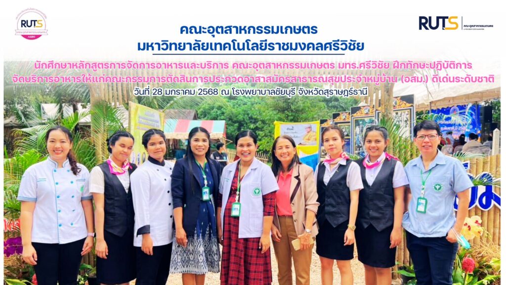 เมื่อวันที่ 28 มกราคม 2568 ที่ผ่านมา นักศึกษาหลักสูตรการจัดการอาหารและบริการ คณะอุตสาหกรรมเกษตร มหาวิทยาลัยเทคโนโลยีราชมงคลศรีวิชัย ได้เข้าร่วมฝึกทักษะปฏิบัติในการจัดบริการอาหารให้แก่คณะกรรมการตัดสินการประกวดอาสาสมัครสาธารณสุขประจำหมู่บ้าน (อสม.) ดีเด่นระดับชาติ ด้านการป้องกันยาเสพติด ณ โรงพยาบาลชัยบุรี จังหวัดสุราษฎร์ธานี ดำเนินการควบคุมดูแลและให้คำปรึกษาโดย ผู้ช่วยศาสตราจารย์ดวงเดือน สงฤทธิ์ รองคณบดีฝ่ายพัฒนานักศึกษา และ ผู้ช่วยศาสตราจารย์จิระนาถ รุ่งช่วง อาจารย์ประจำหลักสูตรการจัดการอาหารและบริการ คณะอุตสาหกรรมเกษตร