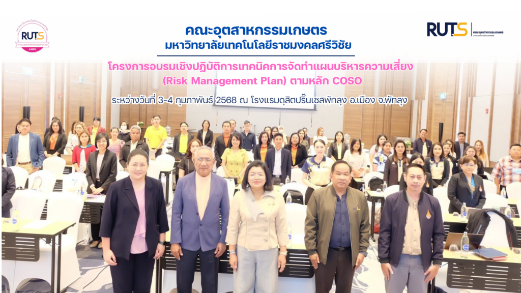 คณะอุตสาหกรรมเกษตร มหาวิทยาลัยเทคโนโลยีราชมงคลศรีวิชัย วิทยาเขตนครศรีธรรมราช ได้เข้าร่วม โครงการอบรมเชิงปฏิบัติการเทคนิคการจัดทำแผนบริหารความเสี่ยง (Risk Management Plan) ตามหลัก COSO โดยมี ผศ.ดร.สุภาษิต ชูกลิ่น รองคณบดีฝ่ายบริหารและวางแผน และนายอรรถพล พรหมทอง นักวิชาการคอมพิวเตอร์ชำนาญการ ร่วมอบรมดังกล่าว ระหว่างวันที่ 3-4 กุมภาพันธ์ 2568 ณ ห้อง Naka ballroom โรงแรมดุสิตปริ๊นเซสพัทลุง อ.เมือง จ.พัทลุง เพื่อจัดทำแผนบริหารความเสี่ยง ระดับมหาลัย และหน่วยงาน ประจำปีงบประมาณ 2568