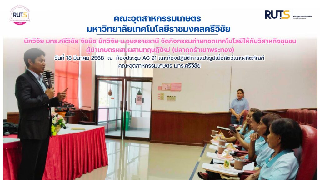 วันอังคารที่ 18 มีนาคม 2568 คณะอุตสาหกรรมเกษตร มทร.ศรีวิชัย นำโดย ผศ.จรีพร เชื้อเจ็ดตน รองคณบดีฝ่ายวิชาการและวิจัย ร่วมกับ คณะเกษตรศาสตร์ มหาวิทยาลัยอุบลราชธานี โดย ผศ.ดร.ปัญจภรณ์ ทัดพิชญางกูร พรหมโชติ จัดกิจกรรมถ่ายทอดเทคโนโลยีให้กับวิสาหกิจชุมชนผู้นำเกษตรผสมผสานทฤษฏีใหม่ (ปลาดุกร้าเขาพระทอง) ต.เขาพระทอง อ.ชะอวด จ.นครศรีธรรมราช เรื่อง “ผลิตภัณฑ์ต้นแบบปลาดุกบิ๊กอุยที่เพิ่มกรดไขมันไม่อิ่มตัวสูง (โอเมกา-3) แช่แข็ง” ระบบการเลี้ยงปลาดุกที่เพิ่มกรดไขมันไม่อิ่มตัวสูง (โอเมกา-3) และการแปรรูปผลิตภัณฑ์ปลาดุกแช่แข็ง เพื่อเพิ่มศักยภาพการแข่งขันในอุตสาหกรรมประมงน้ำจืดแบบครบวงจร ณ ห้องปฏิบัติการแปรรปอาหาร คณะอุดสาหกรรมเกษตร มทร.ศรีวิชัย วิทยาเขตนครศรีธรรมราช โดยได้รับการสนับสนุนงบประมาณจาก หน่วยบริหารและจัดการทุนด้านการเพิ่มขีดความสามารถในการแข่งขันของประเทศ(บพข.) สภานโยบายการอุดมศึกษา วิทยาศาสตร์ วิจัยและนวัตกรรมแห่งชาติ (สอวช.) ในโอกาสนี้ ได้รับเกียรติจากคณบดีคณะอุตสาหกรรมเกษตร ว่าที่ ร.ต.ปรีชา มุณีศรี กล่าวต้อนรับคณะทำงานและผู้เข้าร่วมโครงการ ณ ห้องประชุม AG 21 การถ่ายทอดเทคโนโลยีในครั้งนี้ ทำให้กลุ่มวิสาหกิจชุมชนผู้นำเกษตรผสมผสานทฤษฏีใหม่ (ปลาดุกร้าเขาพระทอง) ได้รับความรู้ในด้านการแปรรูปและการพัฒนาผลิตภัณฑ์ปลาดุกให้มีอายุการเก็บรักษาที่ยาวนานขึ้น รวมทั้งสามารถคำนวณต้นทุนเพื่อตั้งราคาผลิตภัณฑ์ให้มีความเหมาะสมและคุ้มค่าได้.