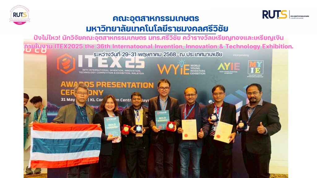 นักวิจัย คณะอุตสาหกรรมเกษตร มทร.ศรีวิชัย ราย ผู้ช่วยศาสตราจารย์จิระนาถ รุ่งช่วง อาจารย์ประจำ หลักสูตรการจัดการอาหารและบริการ คณะอุตสาหกรรมเกษตร ร่วมกับ ผู้ช่วยศาสตราจารย์ ดร.ประชุม คำพุฒ หน่วยวิจัยวัสดุที่เป็นมิตรต่อสิ่งแวดล้อม มทร.ธัญบุรี และ ผู้ช่วยศาสตราจารย์ ดร.ทวิช กล้าแท้ อาจารย์ประจำสาขาวิชาวิศวกรรมโยธา วิทยาลัยเทคโนโลยีอุตสาหกรรมและการจัดการ มทร.ศรีวิชัย พื้นที่ขนอม คว้ารางวัล Gold Medal (เหรียญทอง) จากผลงาน: OPBS BLOCK (VER.2) : Paving Blocks Made from Ocean Plastic and Beach Sand” และ คว้ารางวัล Silver Medal (เหรียญเงิน) จากผลงาน: Palmcharcrete: Carbon sequestration lightweight concrete from biochar จากการเข้าร่วมประกวดผลงานวิจัย สิ่งประดิษฐ์ และนวัตกรรม ภายในงาน ITEX2025 the 36th Internatoonal Invention, Innovation & Technology Exhibition จัดโดย Malaysian Invention and Design Society ซึ่งจัดขึ้นระหว่างวันที่ 29-31 พฤษภาคม 2025 ที่ผ่านมา ณ ประเทศมาเลเซีย