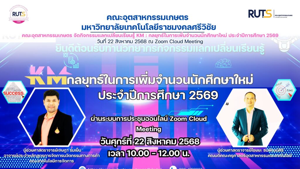 เมื่อวันศุกร์ที่ 22 สิงหาคม 2568 ที่ผ่านมา คณะอุตสาหกรรมเกษตร มทร.ศรีวิชัย จัดกิจกรรมแลกเปลี่ยนเรียนรู้ KM : กลยุทธ์ในการเพิ่มจำนวนนักศึกษาใหม่ ประจำปีการศึกษา 2569 ให้แก่บุคลากรสายวิชาการและสายสนับสนุน ในโอกาสนี้ ได้รับเกียรติจาก ผู้ช่วยศาสตราจารย์ไชยยะ ธนพัฒน์ศิริ คณบดีคณะครุศาสตร์อุตสาหกรรมและเทคโนโลยี และ ผู้ช่วยศาสตราจารย์เจษฎา ร่มเย็น อาจารย์ประจำหลักสูตรการจัดการนวัตกรรมทางการค้า คณะเทคโนโลยีการจัดการ ร่วมแลกเปลี่ยนเรียนรู้ในประเด็นต่าง ๆ เกี่ยวกับกลยุทธ์ในการเพิ่มจำนวนนักศึกษาใหม่ ทั้งในมุมมองของนักการตลาดและมุมมองของหน่วยงานที่ประสบความสำเร็จในการรับนักศึกษา การจัดกิจกรรมในครั้งนี้ ทำให้บุคลากรของคณะฯ ได้รับทราบแนวทางต่าง ๆ ในการเพิ่มจำนวนนักศึกษา กระบวนการคิด กระบวนการวางแผน การปฏิบัติงานที่ส่งผลให้มีจำนวนนักศึกษาเพิ่มขึ้นได้